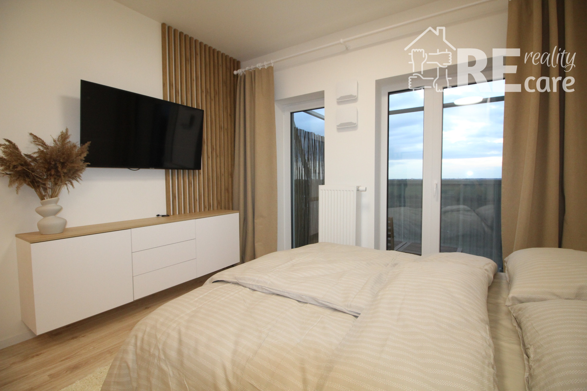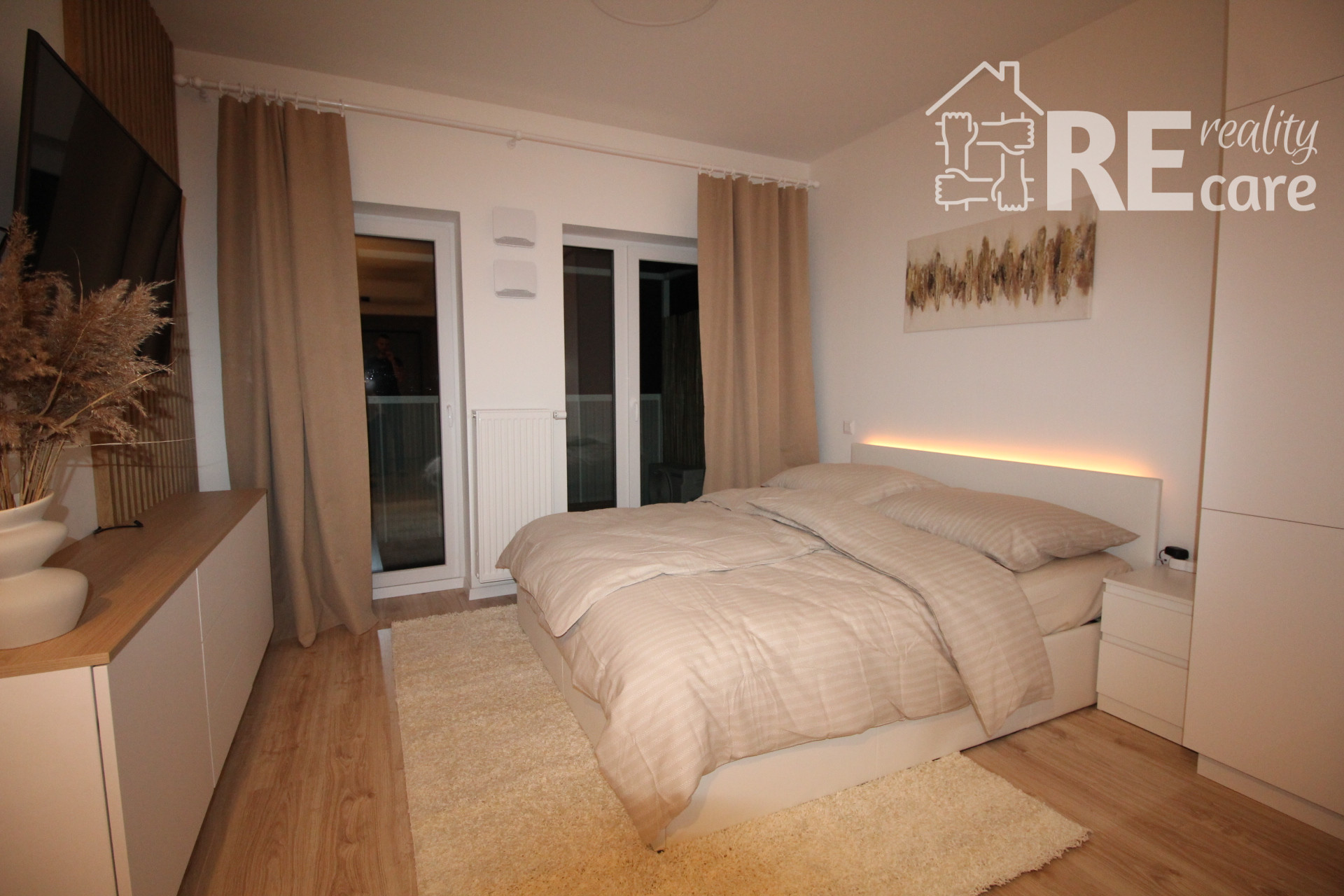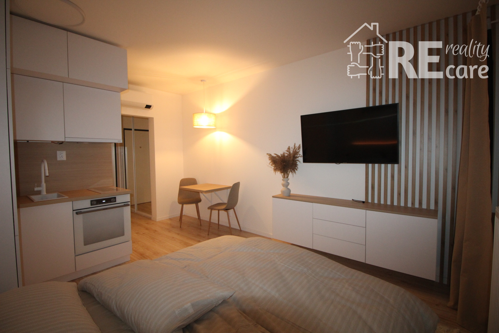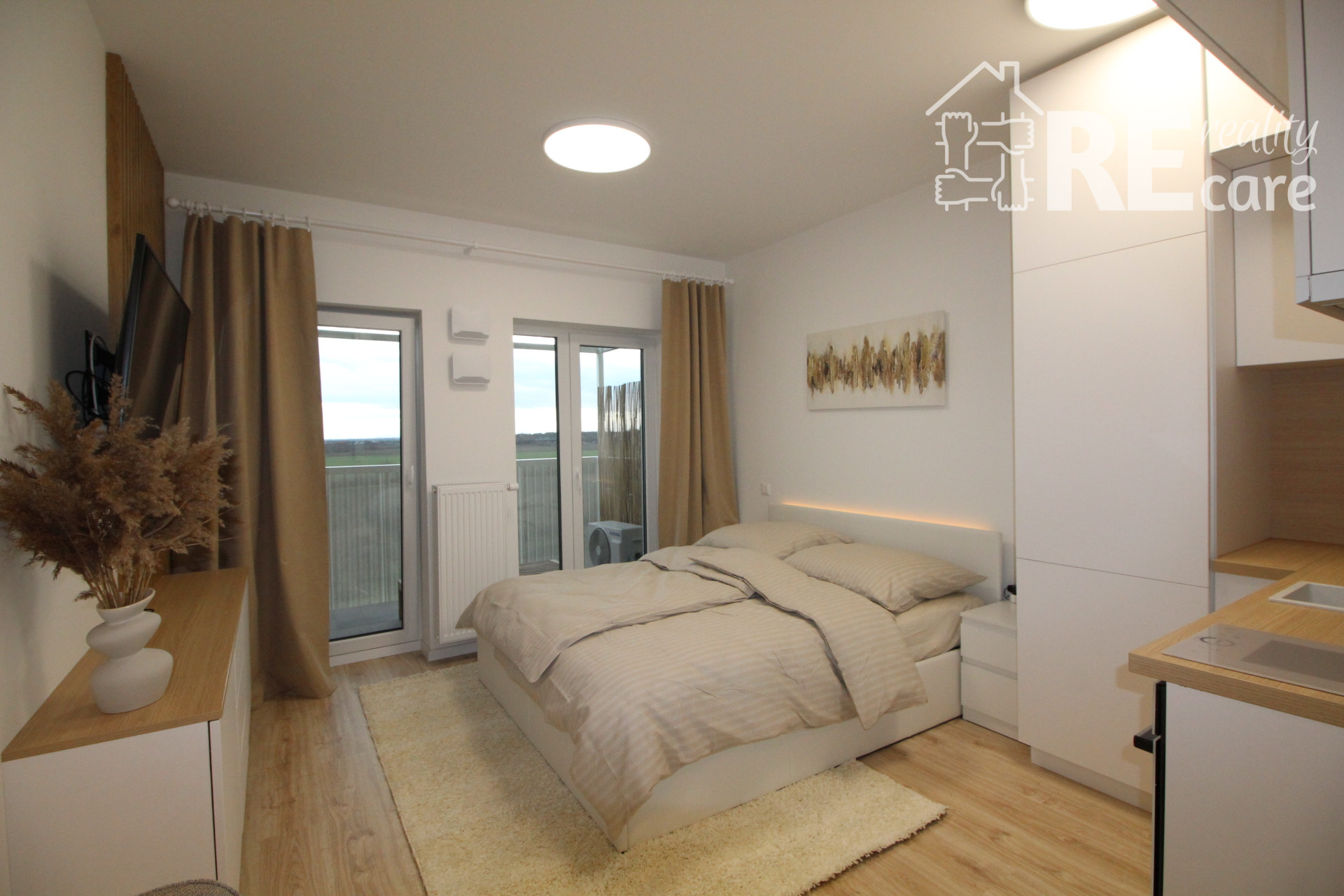 - Ostatný priestor tvorí sklápací jedálenský stôl, stoličky, klimatizácia, smart TV, skrinka pod TV s ďalším praktickým úložným priestorom, manželská posteľ s voliteľným LED podsvietením s opäť veľkým úložným priestorom, nočné stolíky, 9kg tichá práčka s WiFi, komfortné balkónové sedenie s pekným, ničím nerušeným výhľadom.