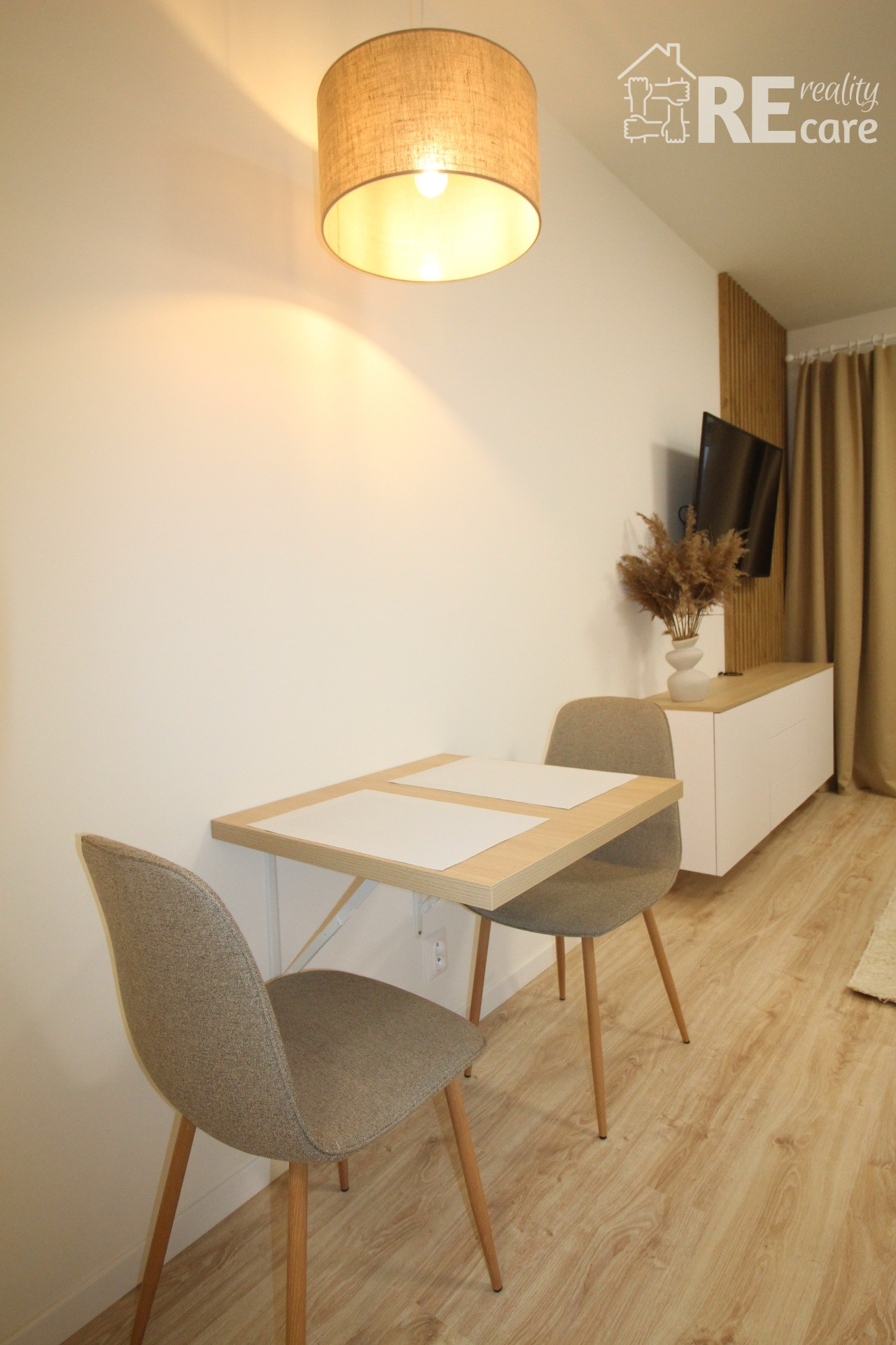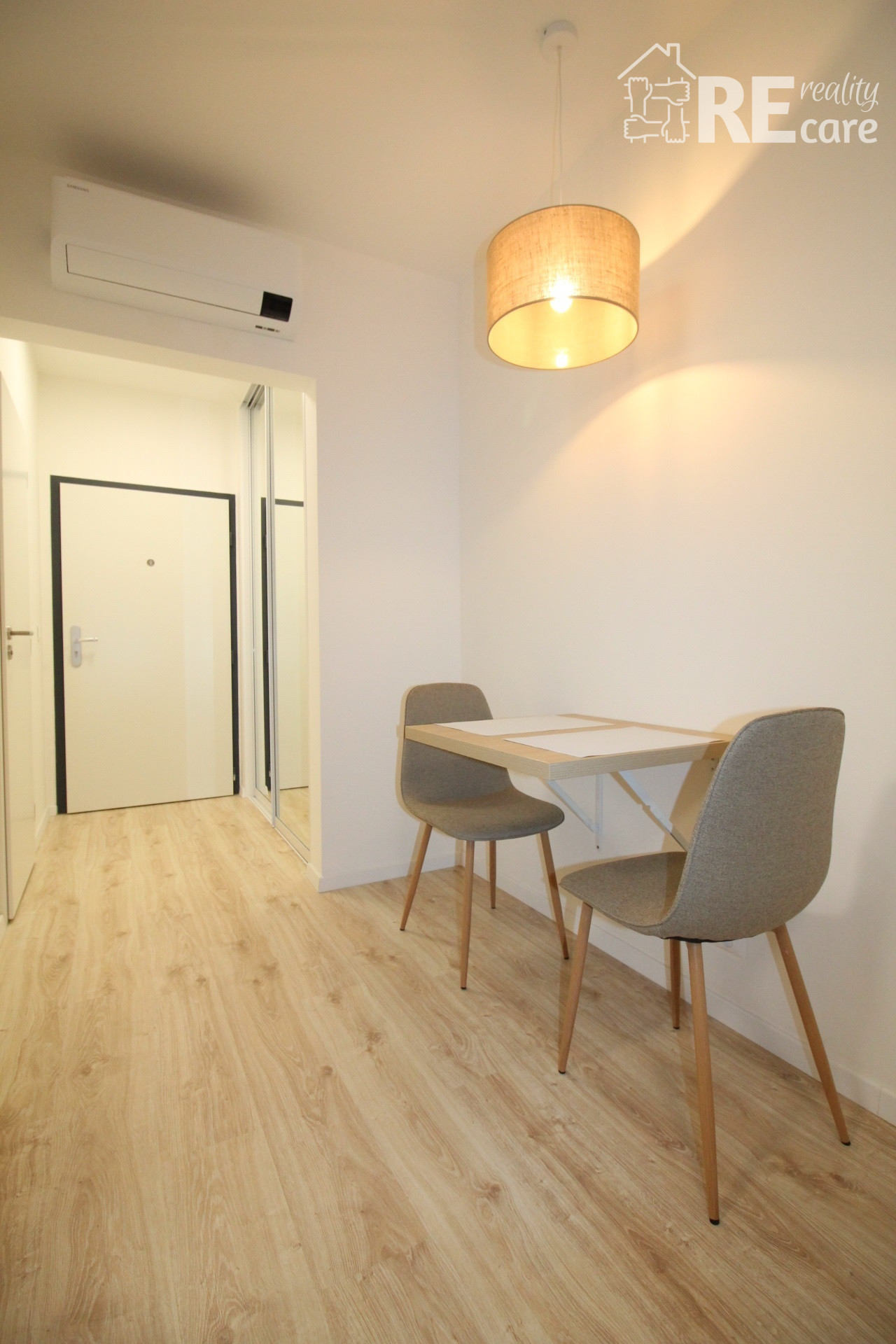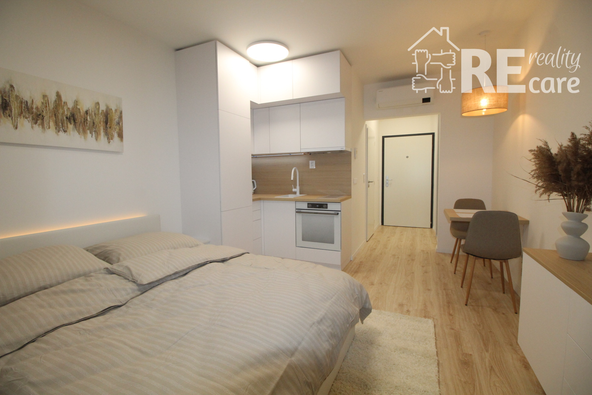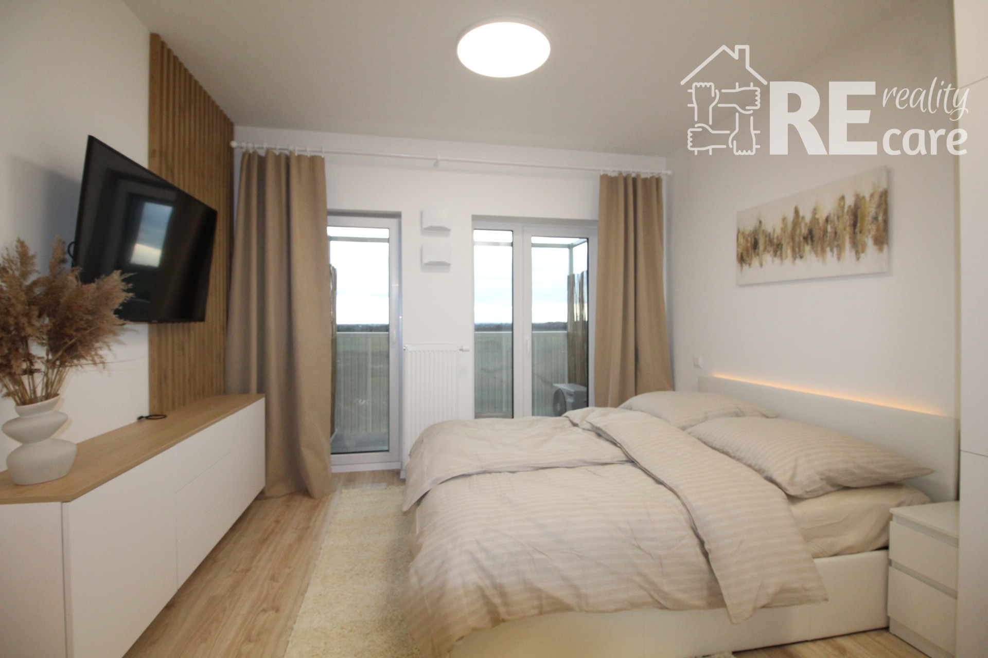 - Ostatný priestor tvorí sklápací jedálenský stôl, stoličky, klimatizácia, smart TV, skrinka pod TV s ďalším praktickým úložným priestorom, manželská posteľ s voliteľným LED podsvietením s opäť veľkým úložným priestorom, nočné stolíky, 9kg tichá práčka s WiFi, komfortné balkónové sedenie s pekným, ničím nerušeným výhľadom.